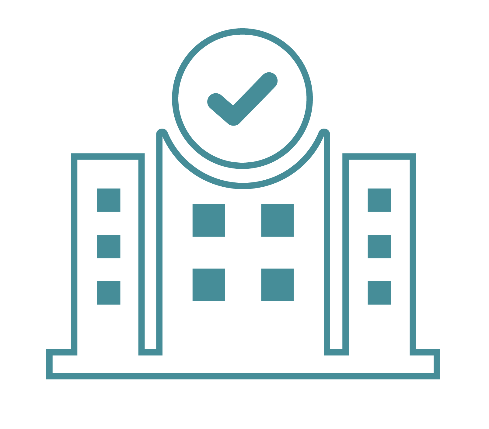 • Outline illustration of a building with a check mark inside a circle above it, indicating approval or successful completion.